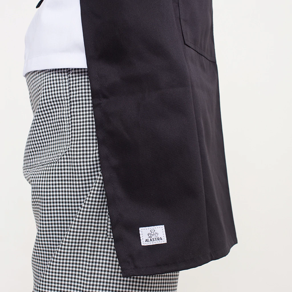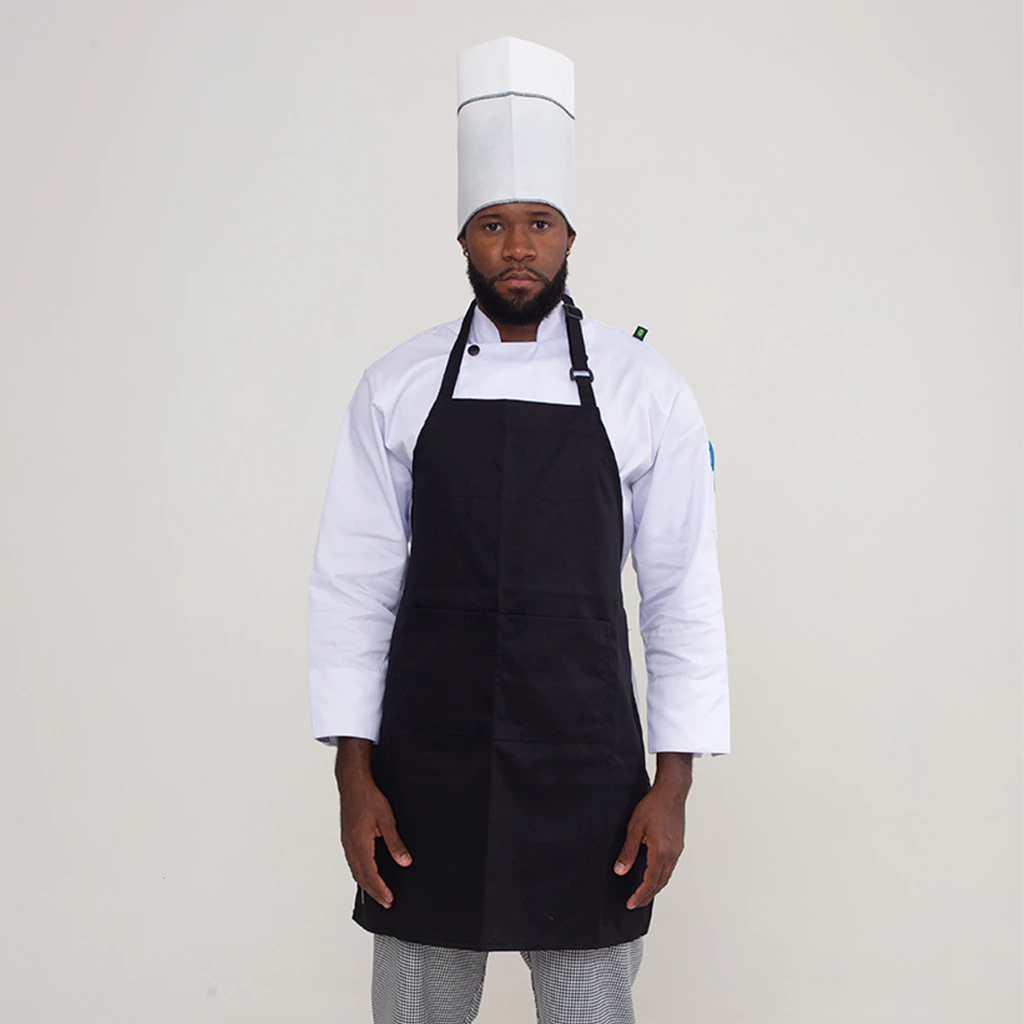 Avental Preto Profissional em Brim, unissex, confortável e durável. Possui ajuste no pescoço e cintura, dois bolsos frontais grandes e é ideal para cozinheiros, chefs, garçons, manicures, barbeiros e profissionais de atendimento. Versátil, elegante e prático para o dia a dia.
