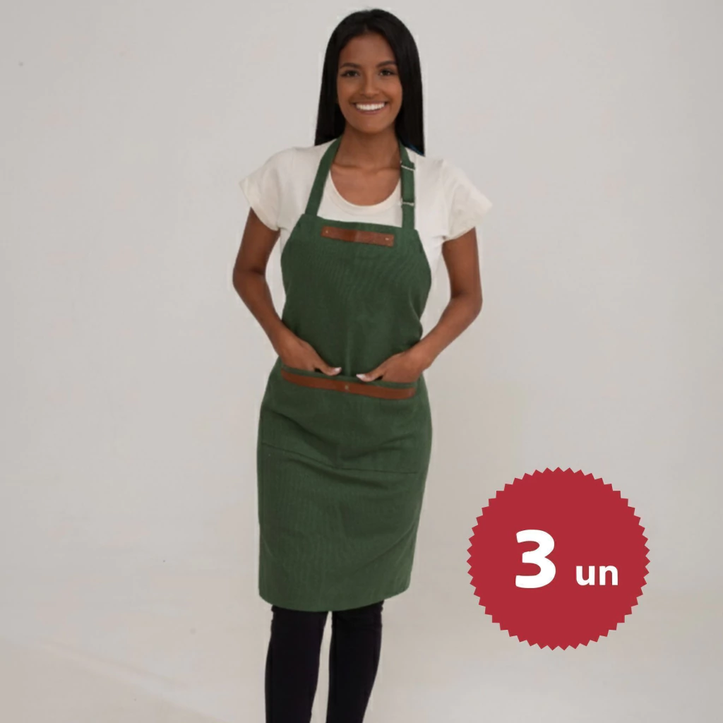 Kit com 3 Aventais Verde Militar Profissional em lona premium com acabamento em couro, unissex, resistentes e estilosos. Cada avental possui ajuste regulável no pescoço com fivela metálica, amarração na cintura e dois bolsos frontais amplos. Ideal para uniformizar equipes de chefs, baristas, bartenders, barbeiros, artesãos e profissionais criativos que buscam durabilidade, funcionalidade e design sofisticado.